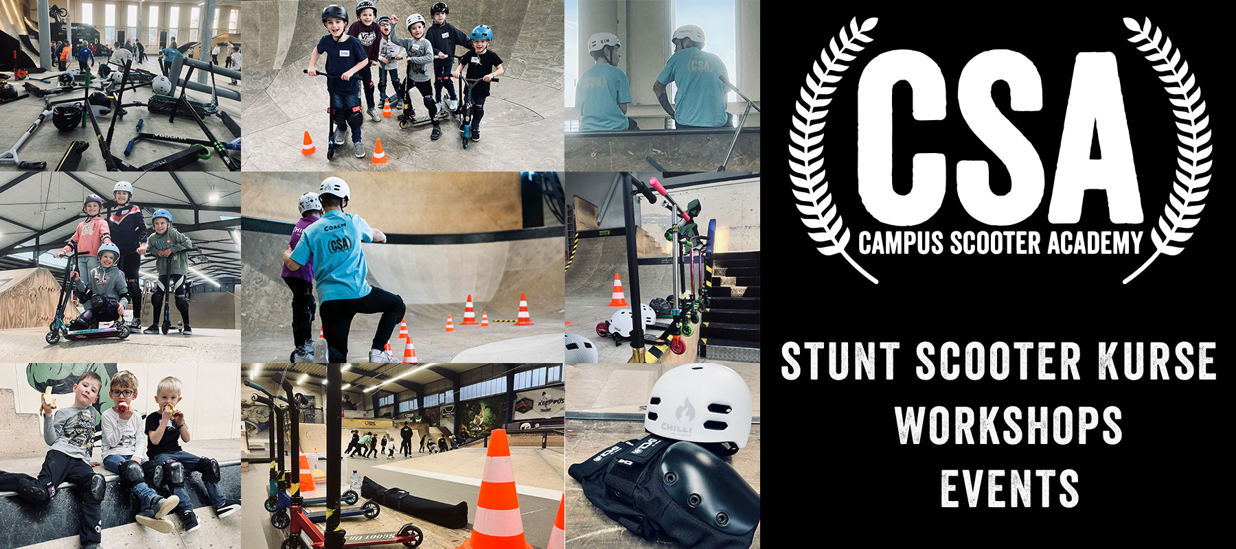2019 haben wir die Campus Stunt Scooter Academy (CSA) gegründet – seitdem sind wir die erfolgreichste und größte Stunt Scooter Schule in Deutschland. Alle unsere Kurse finden in Skatehallen statt und werden exklusiv von uns angemietet, so dass nur die Kursteilnehmer diese nutzen können. Da es nicht so viele spezielle Skatehallen in Deutschland gibt, nehmen viele unserer Kursteilnehmer einen durchschnittlichen Anreiseweg von 200km in Kauf. Das große positive Feedback zeigt, dass sich der Fahrweg lohnt. Wir sind siebenmal in Deutschland vertreten. Du findest uns aktuell in Aurich, Bremen, Hamburg, Ingolstadt, Mühlhausen, Stuttgart, Wuppertal und München. Wir freuen uns, dich kennenzulernen und dir im Stunt Scooter Training tolle Tricks beizubringen. Du hast Fragen? Melde dich gerne bei uns, wir sind jederzeit für dich da. Bis bald beim Stunt Scooter Training!